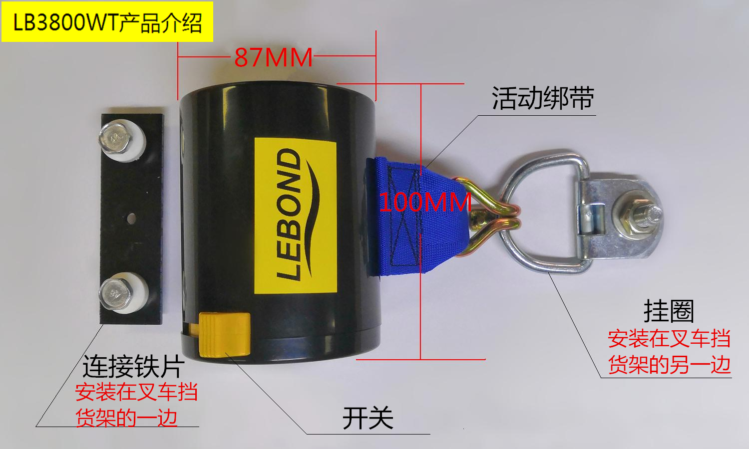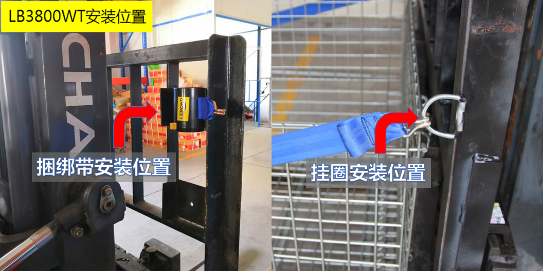 ●捆綁帶安裝在叉車護(hù)欄架右側(cè)(叉車駕馳員右手側(cè))。